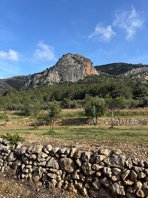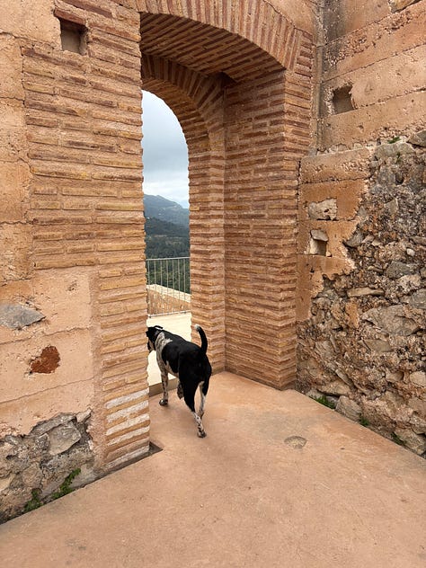 The other redeeming experience was my hike up to the castle across the street from Jasmine and Mar’s house. I could only find one of the dogs, as they frequently go out exploring on their own, so Mija and I set out for the top of the very, very tall rock. I had gotten vague instructions on how to find the trail, but it wasn’t well marked, so I walked probably 1/2 a mile before reaching a dead end. My second attempt was successful as I found a trail behind a somewhat creepy looking abandoned house. I felt more certain that I was on the right path as I started seeing yellow flashes frequently painted on rocks. The way up was a steep incline, sometimes requiring almost crawling straight up over rocks and I became accutely aware of the fact that I was hiking, alone, in Spain, with someone elses dog that I was responsible for. Luckily Mija was surefooted and stopped every now and then to make sure that I was still coming. After about 20 minutes of climbing I encountered the first set of wayfinding signs that indeed confirmed I was on the right trail. Relieved, I looked up to discover that I had made it to the base of the very very tall rock, which was also an area for rock climbing! The wildflowers were going absolutely wild up higher and I had to fight my way through some scrubby brush until I made it above the treeline where things thinned out a bit. It took about an hour to get up to the castle, and once I got up there I felt like letting out a scream of proud success, but I’m glad I walked through the castle first because I found an older German couple eating their lunch, so I’m glad I didn’t startle them. Mija and I drank some water, I ate an apple and a brownie and sat in awe of the fact that I had just scrambled up some rocks to a freaking castle. The castle was built in the 13th century and the town recently received a grant to restore it just enough so it could be safe for visitors, but I still fought off bouts of vertigo looking over the edge of the walls that plummeted down to the forest below. I didn’t feel too confident about my ability to hike back down the way I came without twisting an ankle, so I took my chances on an alternative route that thankfully ended up spitting me back out where I started. The weather was cloudy, slightly windy, and felt a bit dramatic. I felt elated to be walking through the Spanish hills by myself and I think I finally let myself feel a moment of pride for all that I had gotten myself through over the last 2 months. When Mija and I got back to the house we were both appropriately exhausted, and after a lovely 8pm dinner with Mar, I passed right out. On my last day, Mar made a pan of fideua, pretty much paella, but with very short pasta noodles instead of rice. In hindsight, I really enjoyed my 5 days in the Valencian countryside and appreciate the space it gave me to feel some feelings in a beautiful setting. A big thanks to Jasmine and Mar for letting me stay.