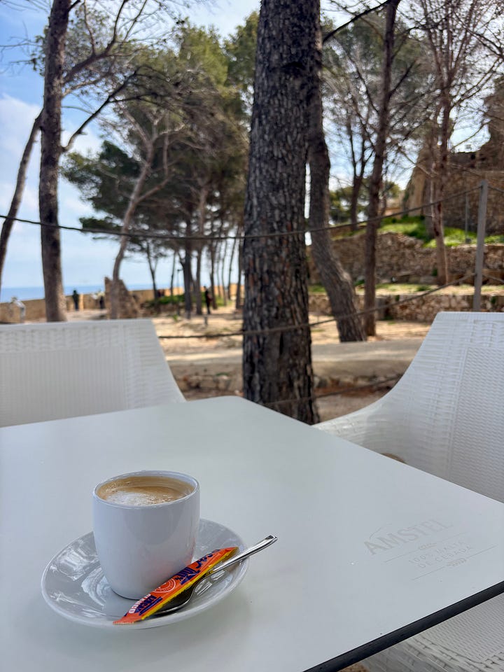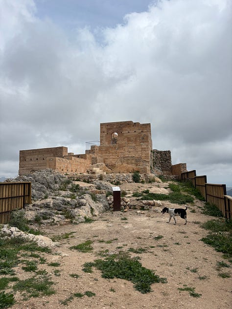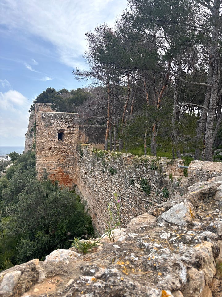 Autumn and I Ubered back to the hostel and spent our last nights in our casita coffins. The next morning I schlepped my backpack to the train station and emotionally waited for my train to Gandía, where I would meet up with my host for a short WorkAway that popped up last minute. It felt so wrong to be leaving Valencia! I felt like I had just scratched the surface with my new friends and there was no part of me that was ready to leave all the fun behind, but free food and housing is just about impossible to turn down after you’ve been traveling for 3ish months. I took the commuter train an hour south to Gandía where I would be picked up by Jasmine. About halfway through the train ride, the landscape turned mountainous and I felt a bit more excitement for the next 5 days. Jasmine lives in the town of Pedreguer with her mom Mar and 3 dogs, Abril, Mija, and Idis. Initially, Mar was going to be out of town, so I was going to be helping Jasmine with taking care of the dogs, but 30 minutes after I arrived, plans changed and Mar was no longer going to Majorca. I wasn’t very sure of my purpose being there anymore, but they insisted it was alright that I stay. The house was a bit out of town, right across from the mountains, and from the backyard you could see the remains of a castle on top of a very high rock. The landscape was breathtaking with wildflowers blooming left and right and terraced groves of olive trees inhabiting the base of the mountains. Jasmine and I took the dogs on a walk to Font d’Aixa, an old spring from when the area was Moorish farmland. There were so many old crumbling stone houses along the trail and I found out that there was a whole system of hiking trails through the mountains that went from one historical landmark to the next. Over the next few days Jasmine took me on tours of the surrounding towns of Pedreguer, Altea, and Denia. Jasmine usually had an errand or two to run so I would go exploring on my own and we would set a point to meet up. She was a little stressed out by the fact that I didn’t have phone service, but we always managed to make it work. I was surprised by how much of a Brit magnet these towns were. Almost everywhere you went, you heard a British accent, and they were rampant on their bicycles, apparently a popular place to come and train for races. Admittedly, I was sort of coming off the high of my time in Valencia, and feeling the impending sadness of the trip coming to a close, so I had a bit of a somber time, but there were some stand out moments and really saved it for me. The day we went to Denia, I had 2 hours of solo time and no idea where I was going, so I went to search for a place to have coffee and draw. I walked for a while and much to my satisfaction, ended up sipping a café con leche in the ruins of a gigantic castle. For me, there’s not much that sitting outside a cafe overlooking the sea in the remains of a 10th century castle wont fix.