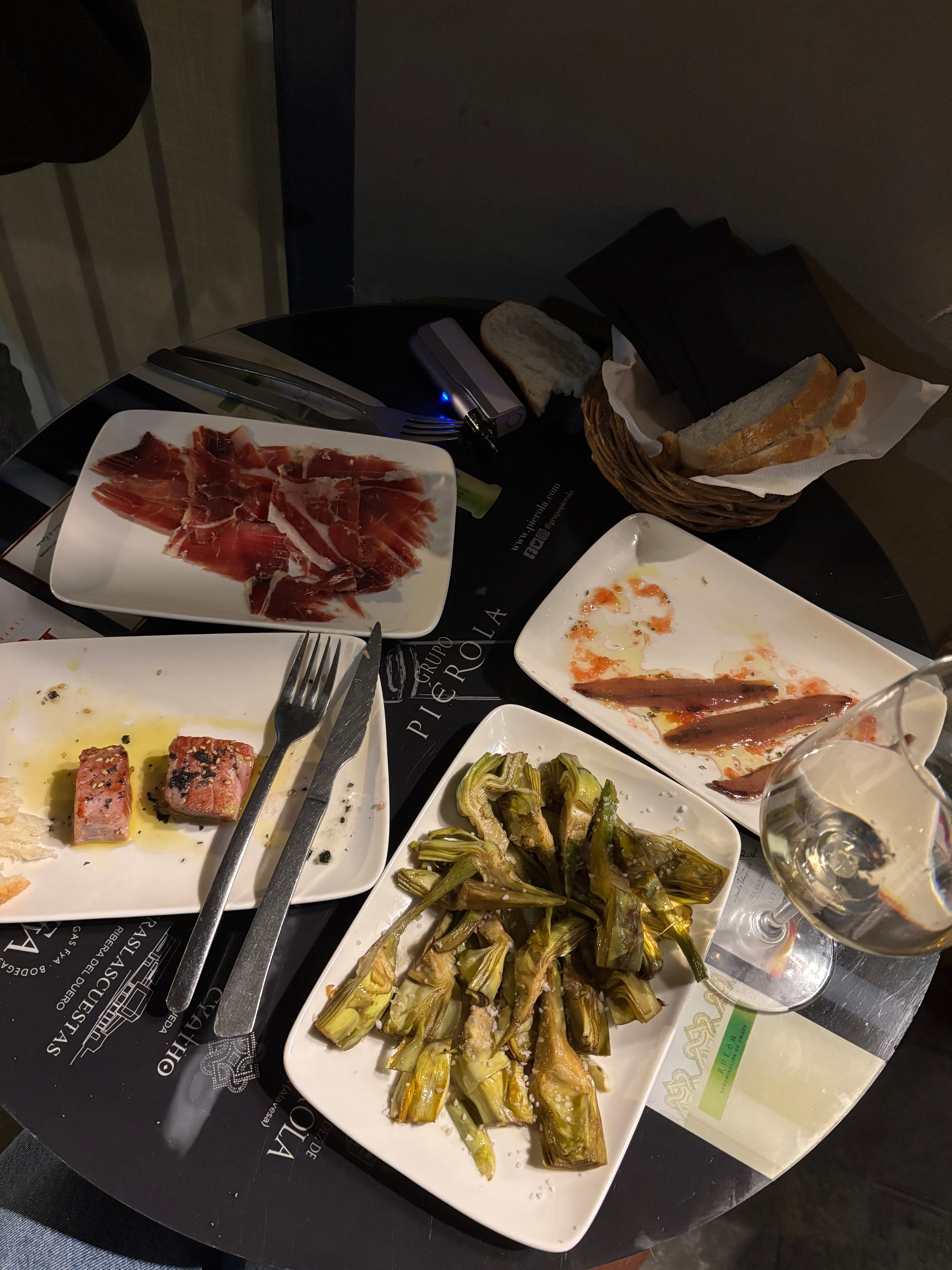 Free walking tours have proved to be such a great thing to do on my travels, I thoroughly recommend the app FreeTours.com! After the tour, I went with a couple people from our group to go try Spanish Orxata (Horchata) made from tiger nuts. I’ve gotta say, I really prefer the horchata in Mexico, made with rice instead. Anyways, I was hanging out with Marie and Basile from France, we got some more paella and ate it in the Turia, enjoying the sun, a rather perfect first half of the day. I had adapted to siesta culture QUICKLY, so after a nap, Marie and I met back up for drinks and dinner. First we had a glass of agua de Valencia and played some cards before we went to go get tapas at a place recommended by our tour guide. I didn’t know that I was in for the best meal of the trip, but god DAMN those tapas were incredible. We had alcachofas (artichokes) sauteed and salted, jamon iberico, atun (tuna) seared, anchoas (anchovies) with tomatoe, and multiple glasses of white wine. We were sitting at a tiny table on the street in the old city and the food was unreal. As we were nearing the end of our meal, an older man approached us and asked “Which one of you are from the United States?” I somewhat reluctantly raised my hand, and then he pulled up a chair and dove in to conversation. I don’t think I ever got this man’s name, but he was there with his wife and the two of them were from Florida. They live part time in Miami and part time in Valencia. At first it was sweet and they were giving us recommendations for food and things to do, but it quickly devolved into the man constantly talking over his wife and telling us about all the elite social clubs he belongs to. He was a part of the English Mens Bullfighting Club, a club for men who speak english and are obsessed with bullfighting… and he was eager to tell us about all of the influence he has gained amongst the Spanish government through being a part of this exclusive mens club. GAG. Marie seemed a little more intrigued by his wealth than I had a tolerance for and I felt my temperature rising each time he interjected his opinion when his wife tried to get a word in. Thankfully it got late and it was past their bedtime, they said goodbye to the owner of the restaurant in their American accented Spanish. If there’s one thing that I’ve solidified on this trip, it’s that I have no more patience for out of touch wealthy folk. Marie and I said goodnight and I never saw her again, that’s just the way it goes, but I’m glad to have had someone to share tapas with.